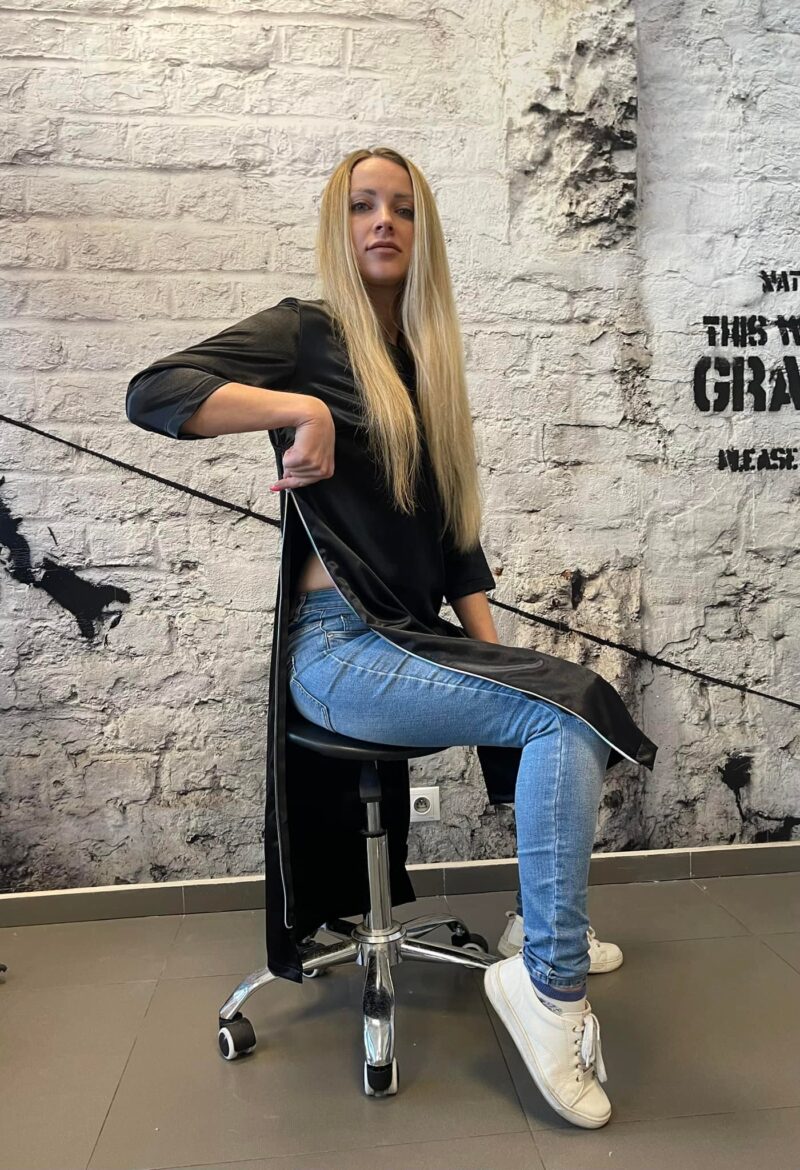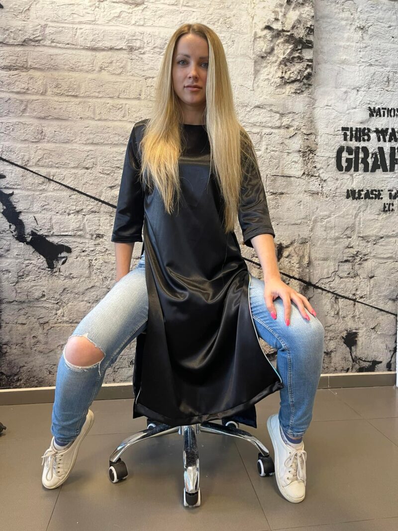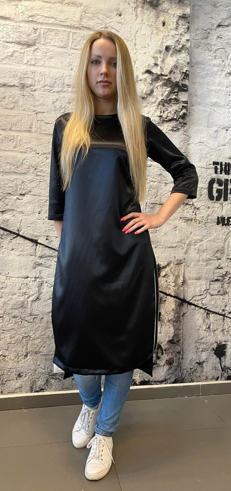 Czarny fartuch zapinany z obu boków kolorowymi zamkami błyskawicznymi, wykonany z materiału typu „satyna”, który oprócz tego, że jest trwały i odporny na częste pranie, świetnie sprawdza się w codziennej pracy dzięki swoim właściwościom które powodują „nie klejenie się” sierści i włosia do fartucha.