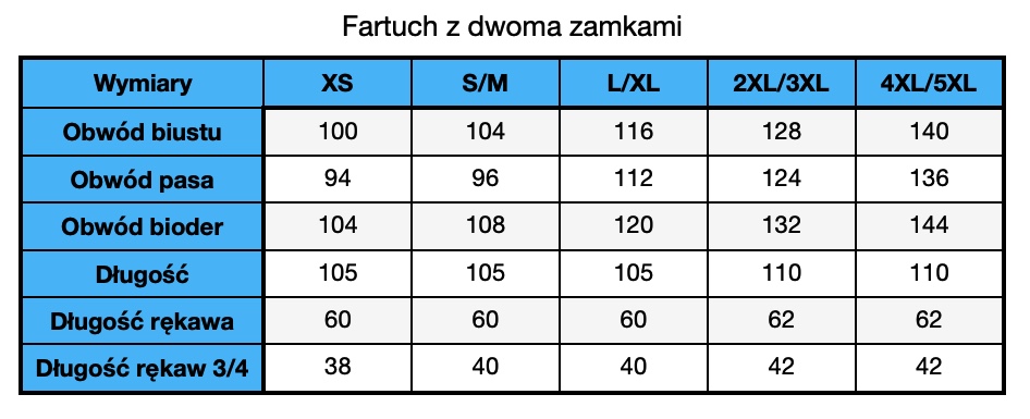 Fartuch wkładany przez głowę, posiada z boków zamki na całej długości, co pozwala na częściowe lub całkowite rozpięcie i wygodną pracę na siedząco